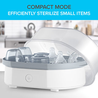 - Modular system: Full size, Compact and Microwave modes. Full size sanitizes up to 6 bottles including nipples, cap rings and lids. Compact Mode is to be used for sterilizing smaller items, feeding accessories and more, and the Microwave mode is the quickest sanitizing cycle fitting most standard microwaves.