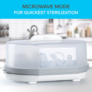The Steam Sterilizer, 3-in-1 Modular System quickly and naturally sanitizes bottles, pacifiers, teethers, toys, and more. With the power of steam, the 3-in-1 Chicco Sterilizer kills 99.9% of harmful household germs. The sterilizer has three possible configurations for different sized loads: convenient full-size mode, efficient compact mode, and quick microwave mode.