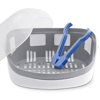 Using tap water, the process takes only a few minutes and involves NO CHEMICALS. The steam generated kills up to 99.9% of harmful household germs and effectively eliminates harmful bacteria. You can sanitize 4 wide mouth or 5 regular bottles and parts. Contents remain sanitized for 24 hours if the lid is not removed. Tongs are included.